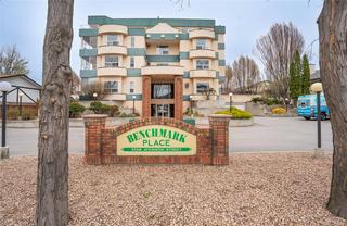 Immaculate top floor, two bedroom, two bathroom unit in Benchmark Place. Recently updated vinyl plank flooring, baseboards and painted through out. Newer appliances, window coverings, primary bedroom air conditioning unit, and hot water tank too. Separate laundry room with extra storage. Gas fireplace for additional heat and ambience plus sliding doors to the covered private patio. Secure underground parkin...